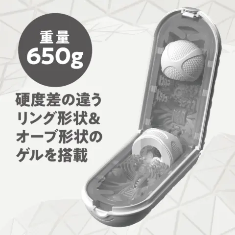 本体の透明ゲルと硬度が異なる、オーブ形状とリング形状の高弾力ゲルを搭載。オーブ形状のゲルはしっかりとした奥付き感と、包み込むような先端刺激を生み出し、リング形状の肉厚なゲルは、ストロークのたびに締め付け感と高度差のアクセントを生み出します。